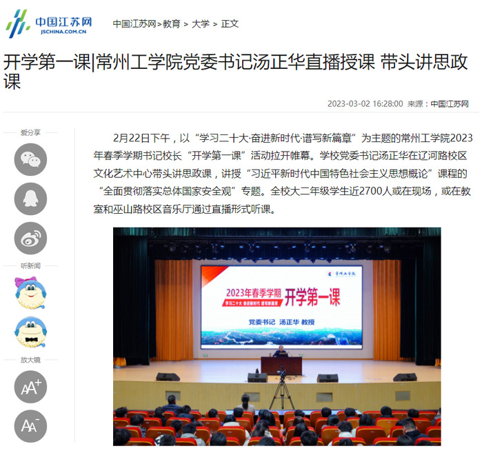 2月22日下午,以“学习二十大·奋进新时代·谱写新篇章”为主题的常州工学院2023年春季学期书记校长“开学第一课”活动拉开帷幕。学校党委书记汤正华在辽河路校区文化艺术中心带头讲思政课,讲授“习近平新时代中国特色社会主义思想概论”课程的“全面贯彻落实总体国家安全观”专题。全校大二年级学生近2700人或在现场,或在教室和巫山路校区音乐厅通过直播形式听课。
