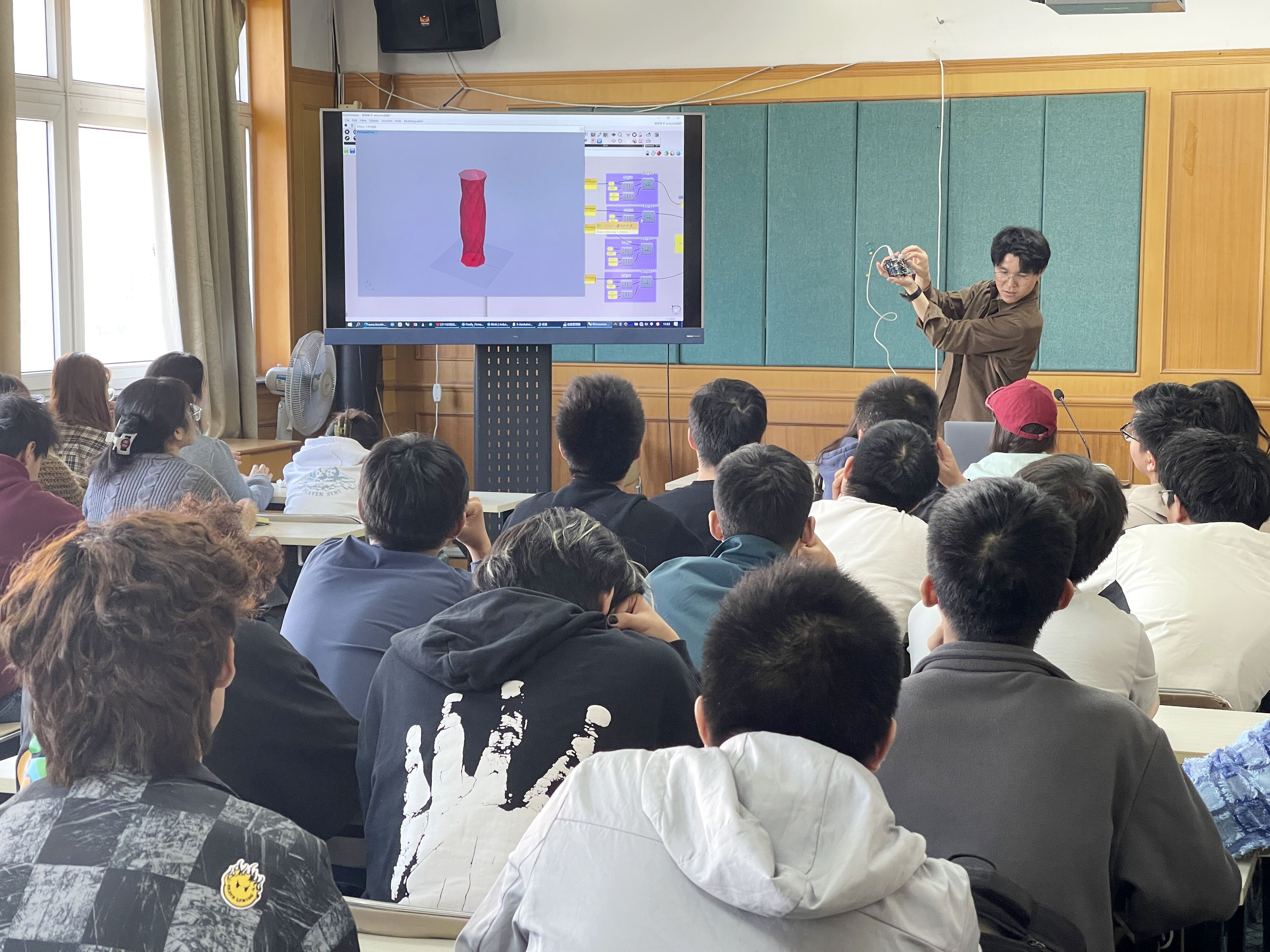 高慧乐曾参与三一重工、LG电子、起亚汽车等项目开发,在产品设计领域有着丰富的理论和实践经验。课程中,高慧乐介绍了智能交互产品开发的相关内容,结合实例分析介绍了主流的各种智能设计工具,如AIGC智能软件、Arduino、MakeyMakey、交互传感器等智能硬件。他通过智能软硬件的实例操作(Arduino+Grasshoper),向同学们生动展示了智能交互产品开发的流程与新技术的应用,让学生深刻地理解产品设计中的科技元素和创新意义。课程最后,高慧乐与大家交流探讨了设计教育与设计师应该怎样面对未来的人工智能。