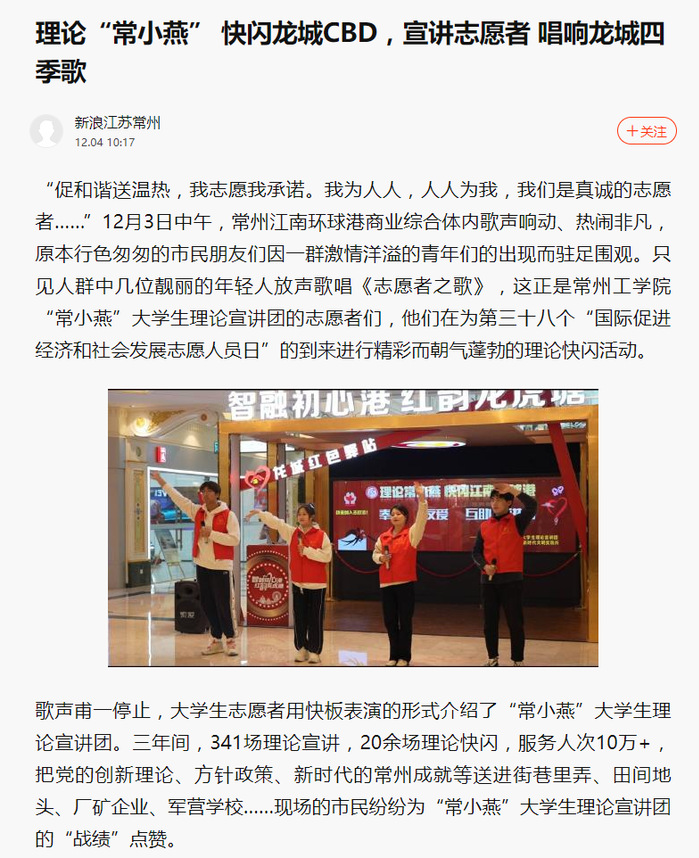 常州工学院“常小燕”大学生理论宣讲团牢记总书记嘱托,坚持用情景剧、相声、快板、社工游戏、歌舞表演、知识问答等多种“热气腾腾”的方式开展理论宣讲服务,让党的创新理论更具人间烟火气,让“常小燕”成为群众喜闻乐见的理论宣讲志愿品牌。在12月5日“国际志愿者日”来临前夕,他们在江南环球港、天宁吾悦、九洲新世界、钟楼龙湖天街等多个商业综合体开展理论快闪活动,宣传倡导志愿精神。