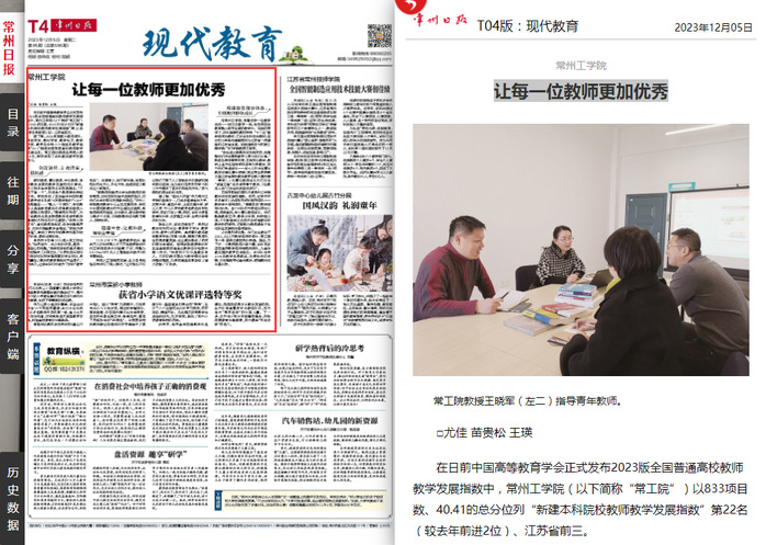据了解,2023版指数从教师团队、教改项目、教材项目、教学论文、教学成效、教学组织等六个维度和教学竞赛“6+1”维度刻画我国高校教师教学发展生态。常工院已连续五年进入前24位,鲜明体现了该校教师教学发展活力。