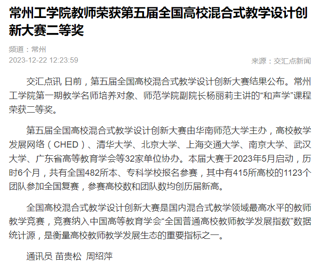 交汇点讯 日前,第五届全国高校混合式教学设计创新大赛结果公布。常州工学院第一期教学名师培养对象、师范学院副院长杨丽莉主讲的“和声学”课程荣获二等奖。