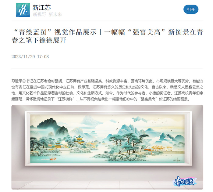 习近平总书记在江苏考察时强调,江苏拥有产业基础坚实、科教资源丰富、营商环境优良、市场规模巨大等优势,有能力也有责任在推进中国式现代化中走在前、做示范。江苏拥有悠久的历史和灿烂的文化,自古以来,就是文人墨客云集之地,用文化艺术作品记录着当时的社会、文化和生活方式。如今,作为时代的参与者、小康的见证者,江苏高校青年们拿起画笔,满怀激情地记录下“江苏模样”,从不同视角绘就出一幅幅他们心中的“强富美高”新江苏的绚丽图景。