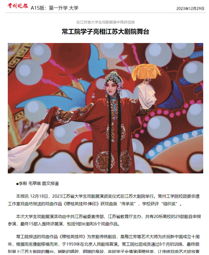 本报讯 12月18日,2023江苏省大学生戏剧展演颁奖仪式在江苏大剧院举行。常州工学院校团委非遗工作室戏曲坊报送的戏曲作品《穆桂英挂帅·捧印》获戏曲类“传承奖”,学校获评“组织奖”。