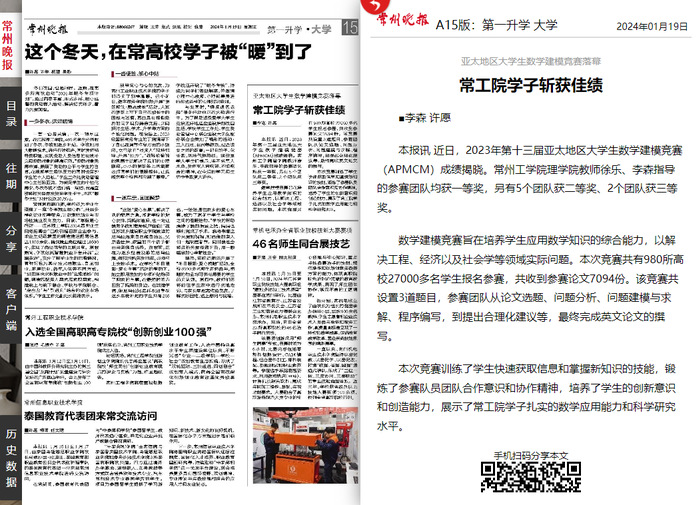 本报讯 近日,2023年第十三届亚太地区大学生数学建模竞赛(APMCM)成绩揭晓。常州工学院理学院教师徐乐、李森指导的参赛团队均获一等奖,另有5个团队获二等奖、2个团队获三等奖。