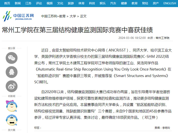 近日,由亚太智能结构技术研究中心网络(ANCRiSST)、同济大学、哈尔滨工业大学、美国伊利诺伊大学香槟分校主办的第三届结构健康监测国际竞赛(IC-SHM 2022)结果公布,常州工学院土木建筑工程学院邓江桦老师指导的谢江山、吴浩同学作品《Automatic Real-time Ship Recognition Using You Only Look Once Network》在“船舶轨迹识别”赛题中喜获三等奖,并被推荐至《Smart Structures and Systems》SCI期刊。
