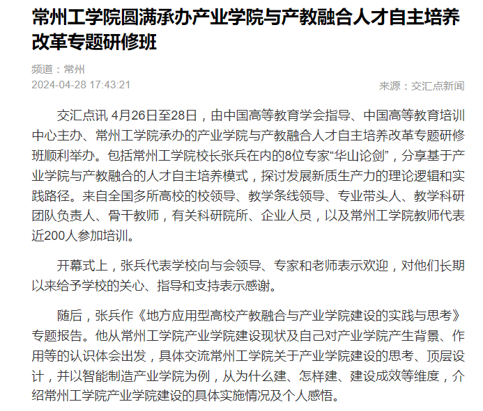 承办本次研修班是常州工学院深入贯彻落实第四次党代会精神的重要举措,是展示产业学院与产教融合人才自主培养的契机,也为构建高质量人才自主培养体系提供了诸多金点子。