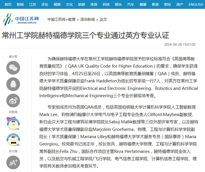 为确保赫特福德大学在常州工学院赫特福德学院授予的学位标准符合《英国高等教育质量规范》(QAA UK Quality Code for Higher Education)的要求,确保学生获得良好的学习体验,4月25日至26日,以英国高等教育质量保障署(QAA)成员、赫特福德大学学术质量保障总监Frank Haddleton为组长的专家组一行7人,对英方在常州工学院赫特福德学院开设的Electrical and Electronic Engineering、Robotics and Artificial Intelligence和Mechanical Engineering三个专业开展现场考查。