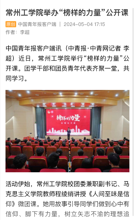 中国青年报客户端讯(中青报·中青网记者 李超)近日,常州工学院举行“榜样的力量”公开课。团学干部和团员青年代表齐聚一堂,共同学习。