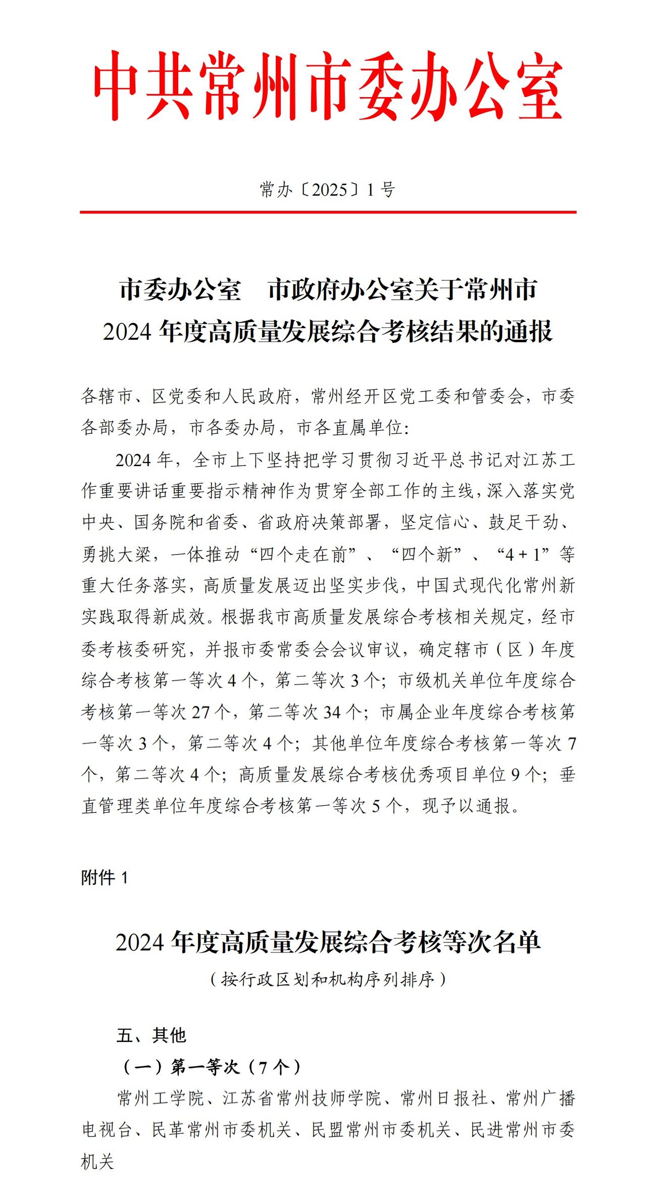 近日,常州市委办公室、市政府办公室公布常州市2024年度高质量发展综合考核结果。我校连续三年获得第一等次。