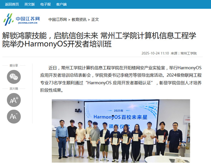 近日,常州工学院计算机信息工程学院在开阳楼网安产业实验室,举行HarmonyOS应用开发者培训总结表彰会,学院党委书记李晓芳等领导出席活动。2024级物联网工程专业73名学生顺利通过“HarmonyOS 应用开发者基础认证”,彰显学院信创人才培养阶段性成果。