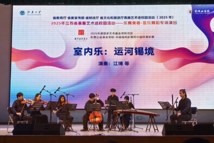 演出以舞蹈《青春摇摆》拉开帷幕,学子们灵动舒展的舞姿迅速点燃现场氛围,将当代青年的蓬勃朝气与昂扬姿态尽情释放。随后,阿卡贝拉《我曾遇到一束光》以纯粹人声和声,勾勒青春寻光逐梦的图景,细腻演绎引发观众情感共鸣。作为演出核心亮点,荣获“2025年国家艺术基金小型舞台剧目”立项资助的室内乐原创作品《运河锡境》格外引人注目。该作品以千年运河为背景,用旋律描绘传统与现代、自然与城市的和谐共生,让观众在音符中感受江南文化底蕴。朗诵《寻光》以铿锵语言,传递当代青年传承历史、追寻理想的赤诚。古筝与钢琴协奏《钗头凤》则将陆游与唐婉的爱情故事融入旋律,古典器乐与现代钢琴的碰撞,为传统诗词赋予新的艺术诠释。