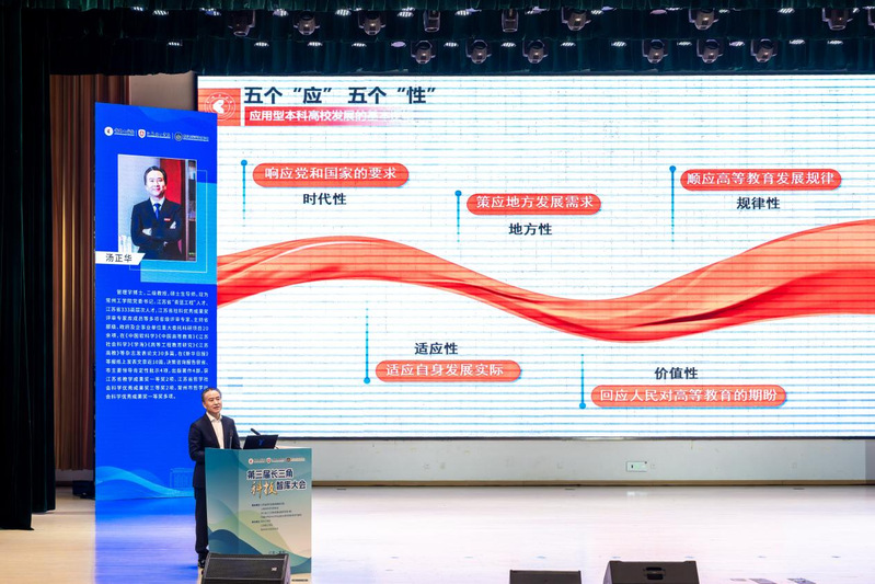 校党委书记汤正华在《科产融合视域下应用型本科高校价值创造分析》报告中指出,应用型本科高校正处于技术革命、产业变革、教育创新的历史性交叉,应主动从“线性合作”转向“科产深度融合”的范式升级。他提出应用型本科高校发展的“五个应”“五个性”基本逻辑——响应国家战略要求(时代性)、策应地方发展需求(地方性)、顺应高等教育规律(规律性)、适应自身实际发展(适应性)、回应人民对高等教育的期盼(价值性),有力推动高校成为产业升级的“人才库”与“技术源”,实现教育链、创新链与产业链衔接。