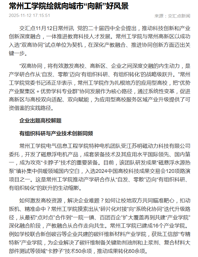 常州工学院电气信息工程学院特种电机团队受江苏明磁动力科技有限公司委托,开发了磁悬浮电机产品,成套装备技术及其应用水平国际领先、国内第一,成为攻克“卡脖子”技术的重要装备。目前,该团队研发成果“磁悬浮水源热泵”填补集中供暖领域国内空白,入选2024中国高校科技成果交易会120项路演项目之一。这是常州工学院推动产学研合作从“自发、零散”迈向“有组织科研、有组织转化”的跃升的生动缩影。