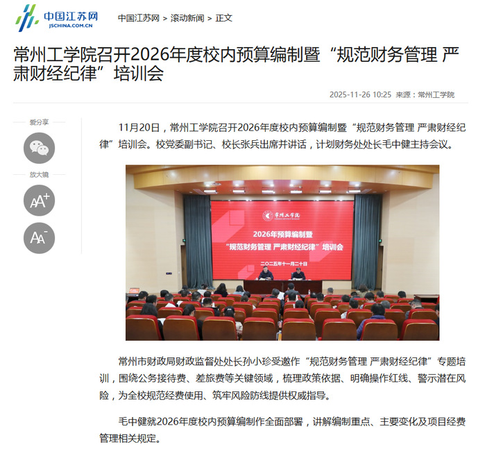 常州市财政局财政监督处处长孙小珍受邀作“规范财务管理 严肃财经纪律”专题培训,围绕公务接待费、差旅费等关键领域,梳理政策依据、明确操作红线、警示潜在风险,为全校规范经费使用、筑牢风险防线提供权威指导。