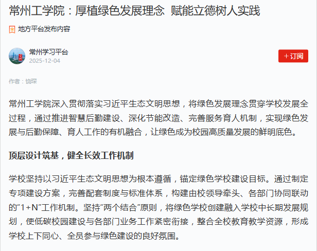 常州工学院深入贯彻落实习近平生态文明思想,将绿色发展理念贯穿学校发展全过程,通过推进智慧后勤建设、深化节能改造、完善服务育人机制,实现绿色发展与后勤保障、育人工作的有机融合,让绿色成为校园高质量发展的鲜明底色。