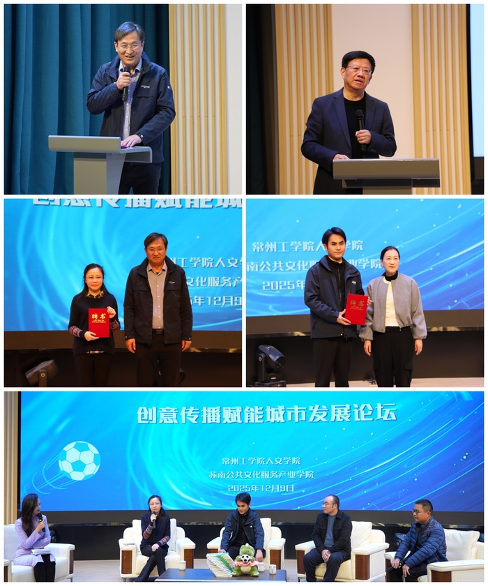 12月9日,由常州工学院人文学院、苏南公共文化服务产业学院主办的第二届创意传播赋能城市发展论坛,在人文学院演播厅举行。论坛围绕“苏超出圈、常州出彩”主题,汇聚高校学者与媒体从业者,共同探讨创意传播与城市发展的融合路径。常州工学院副校长苍玉权、人文学院院长谢燕红、苏州大学传媒学院院长陈龙等出席开幕式,人文学院广播电视编导专业师生参加活动。