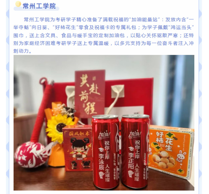 常州工学院为考研学子精心准备了满载祝福的“加油能量站”:发放内含“一举夺魁”向日葵、“好柿花生”零食及祝福卡的专属礼包;为学子佩戴“鸿运当头”围巾,送上含文具、食品与暖手宝的定制加油包,以贴心关怀驱散严寒;还特别为家庭经济困难考研学子送上专属温暖,以多元支持为每一位奋斗者注入冲刺动力。