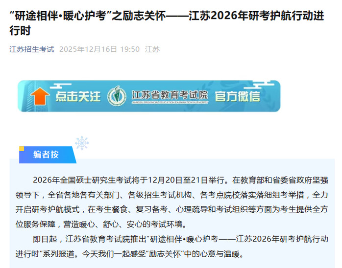 即日起,江苏省教育考试院推出“研途相伴•暖心护考——江苏2026年研考护航行动进行时”系列报道。今天我们一起感受“励志关怀”中的心意与温暖。