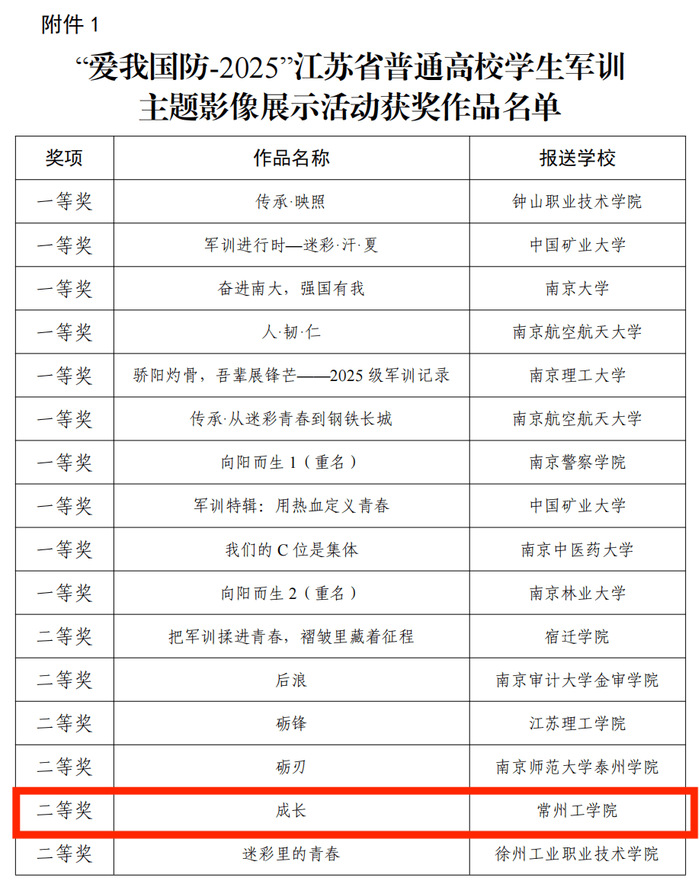 近日,江苏省学校国防教育和军事课教学指导委员会公布了“爱我国防-2025”江苏省普通高校学生军训主题影像展示活动评选结果,我校经济与管理学院选送作品《成长》荣获二等奖。