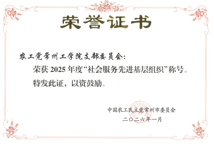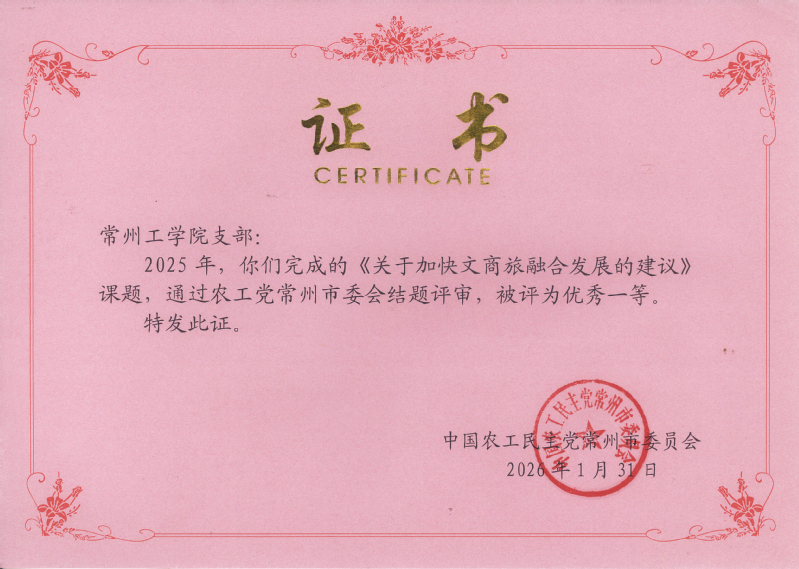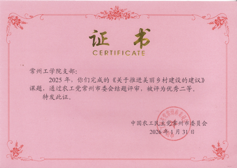 近日,农工党常州市第十三届委员会第九次全体(扩大)会议召开。会上公布了2025年度市委会调研立项课题结题评审结果,并通报2025年基层组织考核结果,对先进集体和先进个人进行表彰。农工党常工院支部被评为“社会服务先进基层组织”,支部主委李凌燕主持的农工党2025年度调研课题《关于推进美丽乡村建设的建议》《关于加快文商旅融合发展的建议》分别被评为优秀一等奖和二等奖,支部宣传委员陈婧获评“优秀党员”。