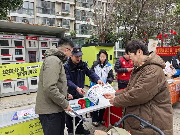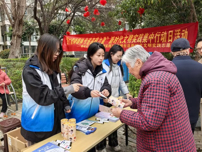 在秦岭社区,志愿者化身文明宣传员,通过设点宣传、发放资料,普及反诈防骗、扫黄打非、垃圾分类等知识,同时宣传旧衣回收公益项目,向老人讲解环保理念。
