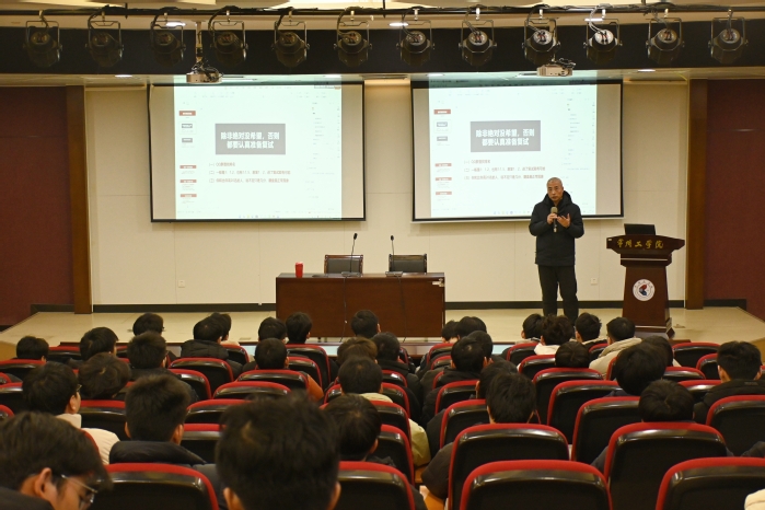 会上,毛国勇结合多年招录经验,围绕复试核心环节系统指导,强调复试重要性,详细讲解复试流程、简历制作、自我介绍、专业问答等重点,并解读调剂政策与志愿填报,为学生答疑解惑、提供实用方法。