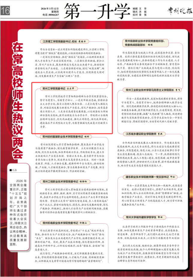 常州工学院将把学习贯彻两会精神与办学实践紧密结合,坚守为党育人、为国育才初心。一是筑牢政治忠诚,坚持社会主义办学方向,落实立德树人根本任务。二是扛起育人强校之责,对接区域发展与新质生产力需求,深化产教融合,培养高素质应用型人才。三是夯实高质量发展根基,以巡视整改与审核评估整改为契机,提升治理能力与办学水平。学校将以全国两会精神为指引,优化内涵建设、强化应用特色、深化改革创新,建设高水平应用型地方大学,为教育强国与民族复兴贡献常工力量。